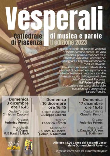 Domenica 3 dicembre alle ore 16.45 interviene l’artista Christian Zucconi, scultore, autore di opere presenti anche nelle chiese piacentine. Ad accompagnare l’evento sarà l’organo suonato da Federico Perotti con brani scelti da Dupré, Bossi e Bach.