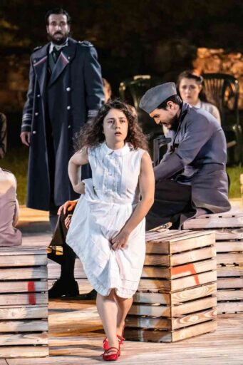 Lo spettacolo allestito in una zona dell’area archeologica mai utilizzata prima, quella dell’antica cisterna. In questo spazio circolare, sospeso nel nulla e per questo molto evocativo, Russo Alesi ha scelto di ambientare l’Aulide, creando un palcoscenico intorno al quale il pubblico ha preso posto, a stretto contatto con gli attori e la scena (mentre tra i cipressi svettava l’elmo di Achille). Un evento corale di grande fascino e potenza, ricco di spunti di riflessione con profondi agganci all’attualità: il patriarcato, la guerra, il sacrificio.
