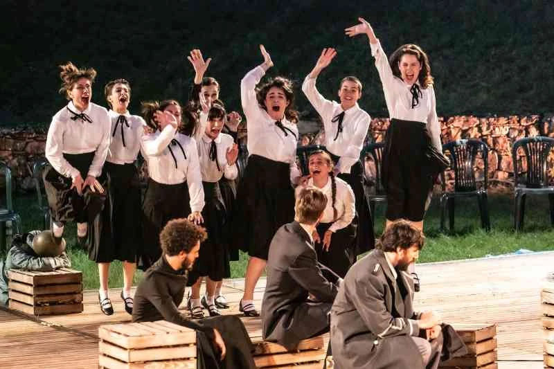 Lo spettacolo allestito in una zona dell’area archeologica mai utilizzata prima, quella dell’antica cisterna. In questo spazio circolare, sospeso nel nulla e per questo molto evocativo, Russo Alesi ha scelto di ambientare l’Aulide, creando un palcoscenico intorno al quale il pubblico ha preso posto, a stretto contatto con gli attori e la scena (mentre tra i cipressi svettava l’elmo di Achille). Un evento corale di grande fascino e potenza, ricco di spunti di riflessione con profondi agganci all’attualità: il patriarcato, la guerra, il sacrificio.