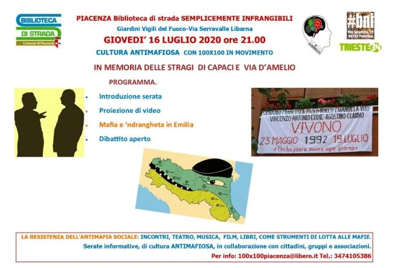 Le serate di cultura antimafiosa, promosse da 100×100 in movimento-APS presso la Biblioteca di strada del Comune di Piacenza, riprendono giovedì 16 luglio. Appuntamento alle ore 21.00