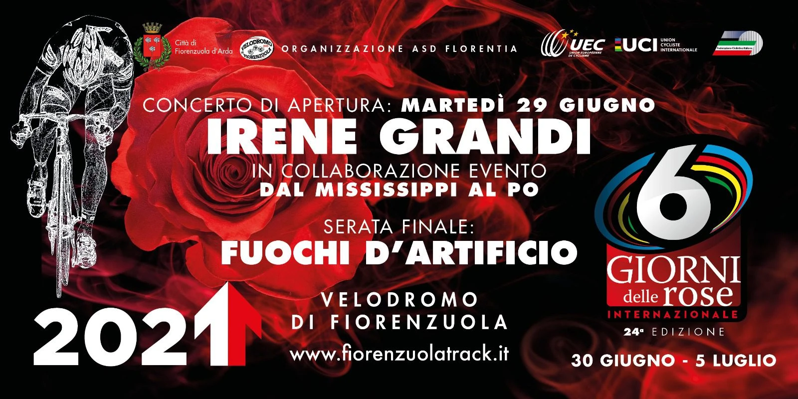 Sarà il concerto di Irene Grandi ad aprire la 24^ edizione della 6 Giorni delle Rose Internazionale di Fiorenzuola d’Arda (Piacenza), nella serata di martedì 29 giugno, alla vigilia della gara di ciclismo su pista che porterà al Velodromo “Attilio Pavesi” (dal 30 giugno al 5 luglio) campioni e campionesse da tutto il mondo, alcuni dei quali si sfideranno nuovamente poche settimane dopo ai Giochi Olimpici di Tokyo.