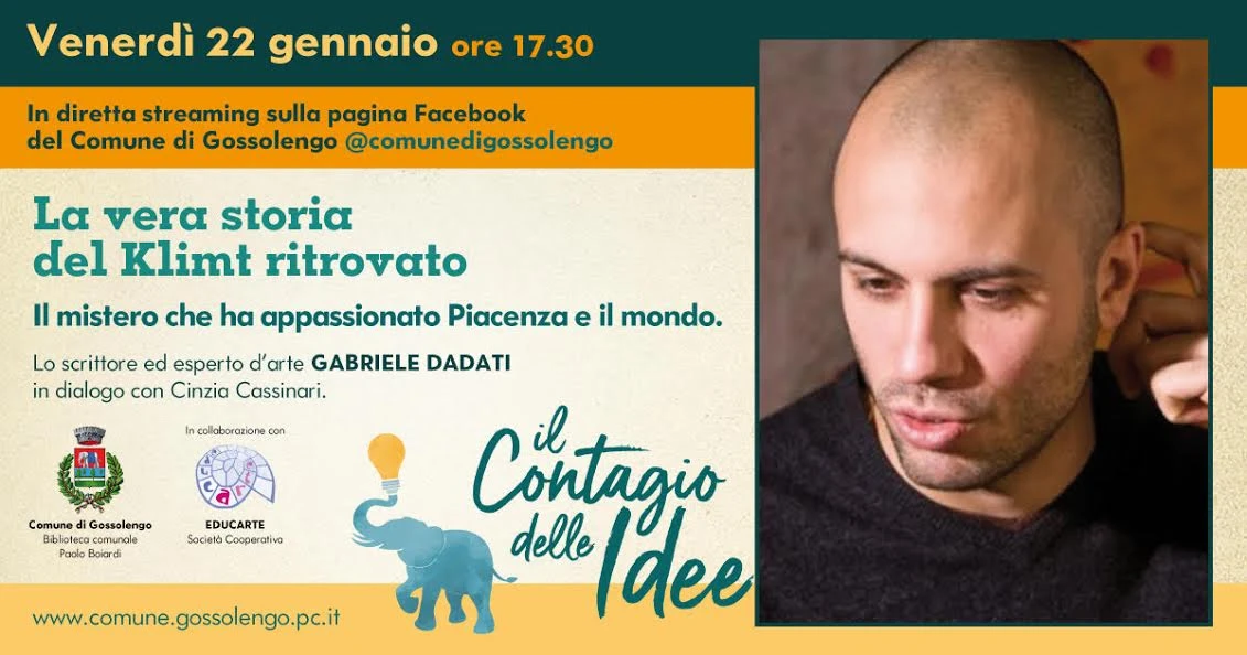 Dopo l’anteprima con il prof. Cavanna, la rassegna culturale online organizzata dalla biblioteca di Gossolengo riparte venerdì 22 gennaio con ospite lo scrittore Gabriele Dadati. Si parlerà del Klimt ritrovato e di come arte e bellezza possano essere antidoto all’isolamento e risorsa per il territorio.