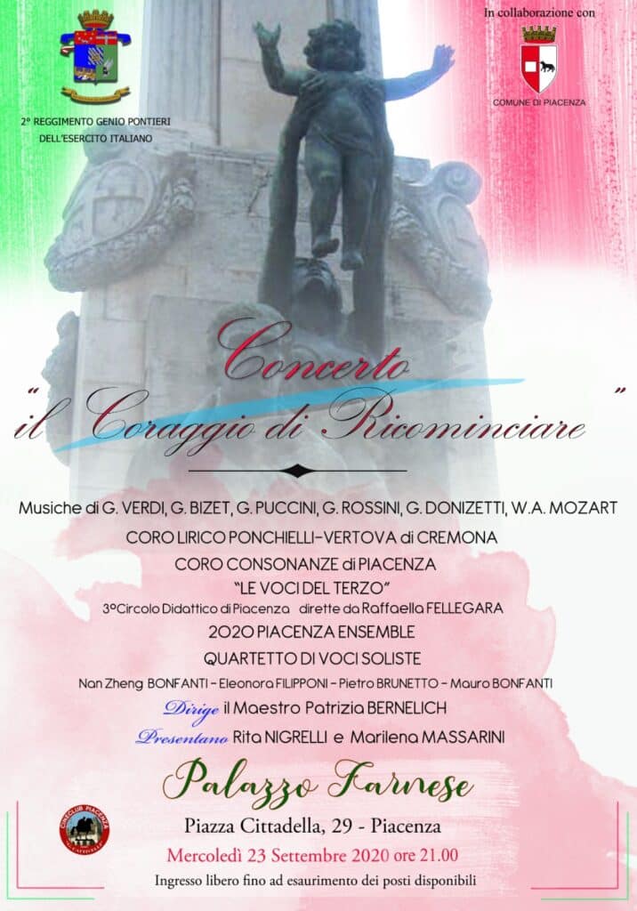 “Il Coraggio di Ricominciare”. Titolo evocativo per il concerto in programma il prossimo 23 settembre, alle 21, nel cortile di Palazzo Farnese. A organizzare l’evento il 2° Reggimento Genio Pontieri, in collaborazione con il Comune di Piacenza. Un evento che si svolgerà nel pieno rispetto delle norme anti-Covid. A presentare la manifestazione l’assessore alla Cultura del Comune di Piacenza, Jonathan Papamarenghi, il comandante di Reggimento, colonnello Salvatore També, e il direttore d’orchestra, Patrizia Bernelich.