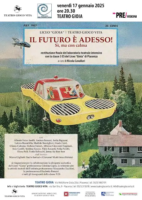 Una riflessione sul futuro e sulle scelte, non senza un pizzico di ironia. Ce la propone attraverso i linguaggi del teatro la classe 3E Scientifico del Liceo “Gioia” di Piacenza che venerdì 17 gennaio alle ore 20.30 al Teatro Gioia sarà protagonista di “IL FUTURO È ADESSO! Sì, ma con calma”, restituzione finale di un laboratorio teatrale intensivo di Teatro Gioco Vita condotto da Nicola Cavallari.