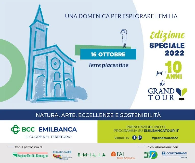 Grand Tour Emil Banca vanta il patrocinio della Regione Emilia-Romagna, Plastic-FreER, FAI Emilia Romagna. Per questo appuntamento si aggiungono anche la Destinazione Turistica Emilia, Confcooperative Reggio Emilia e Parchi del Ducato.