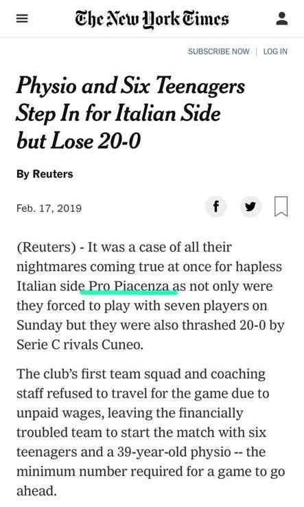 I 20 gol subiti da Pro Piacenza arrivano fino a New York. Infatti anche il “The New York Times” si è occupato della clamorosa sconfitta della squadra rossonera scesa in campo a Cuneo con soli 7 giovani giocatori e il massaggiatore.