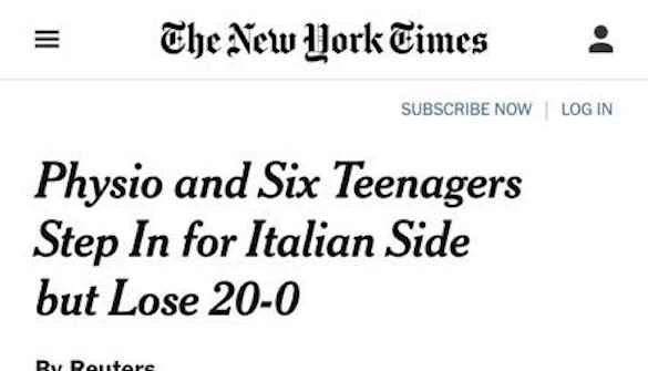 Il noto quotidiano ha titolato: “Il Physio and Six Teenagers Step In for Italian Side but Lose 20-0”.