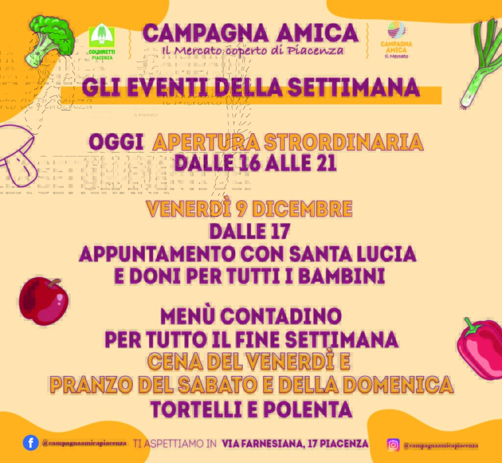 Venerdì 9 dicembre il Mercato Coperto di Campagna Amica sarà avvolto da una dolce magia per la tappa eccezionale di Santa Lucia. Dalle 17 alle 18 tutti i bambini potranno scrivere o portare le loro letterine da imbucare nella cassettina magica, incontrare Santa Lucia e ricevere dolci doni in regalo. Sarà un momento emozionante, realizzato con la preziosa collaborazione di Coldiretti Donne Impresa, cui seguirà la cena al Mercato Coperto con un menù della tradizione, che prevede tortelli e polenta e che sarà disponibile anche nei pranzi contadini di sabato e domenica. E’ possibile prenotare il proprio tavolo oppure l’agribag con il pasto da asporto, telefonando al 335-5330455. La mattinata di domenica 11 dicembre sarà animata anche dalla diretta di Radio Sound, che trasmetterà con una postazione direttamente dal Mercato Coperto.