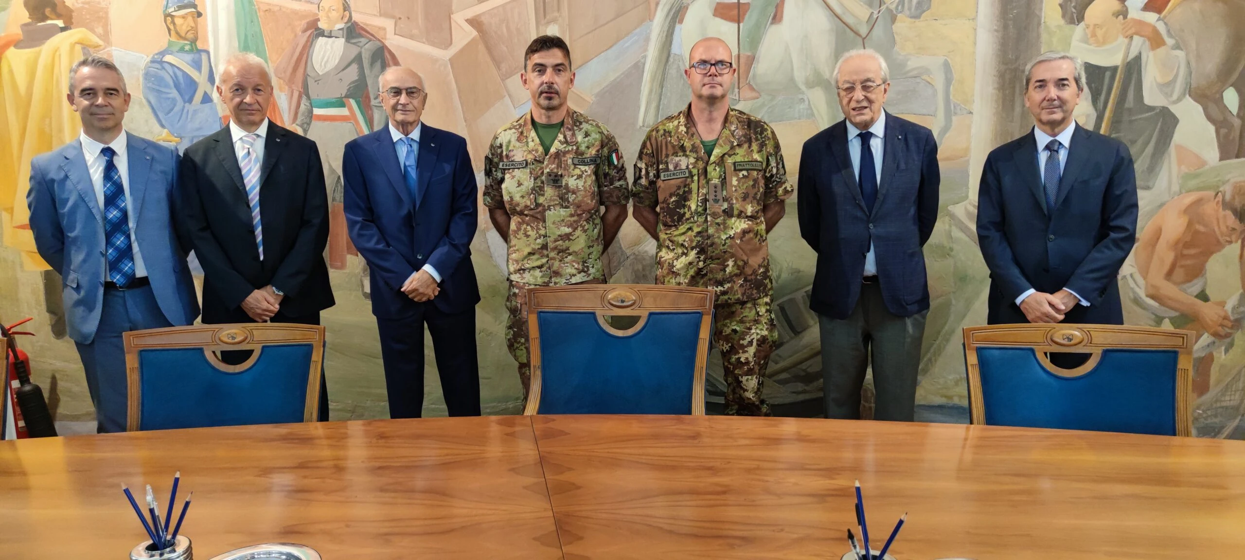 Il nuovo comandante del 2° Reggimento Genio Pontieri col. Fabio Frattolillo (45 anni, già a capo del I Battaglione Pontieri) ha fatto visita alla Banca di Piacenza accompagnato dal col. Federico Collina, comandante uscente. Ai militari del Genio – accolti dal presidente del Cda Giuseppe Nenna, dal presidente esecutivo Corrado Sforza Fogliani, dal direttore generale Angelo Antoniazzi, dal condirettore generale Pietro Coppelli e dal vicedirettore generale Pietro Boselli – è stata mostrata, oltre ai locali operativi dove sono esposte alcune delle opere più importanti della collezione d’arte della Banca, la Sala del Consiglio di Amministrazione affrescata dal pittore piacentino Luciano Ricchetti. Gli ospiti sono poi stati accompagnati sulla terrazza panoramica, con vista a 360 gradi del nostro centro storico.