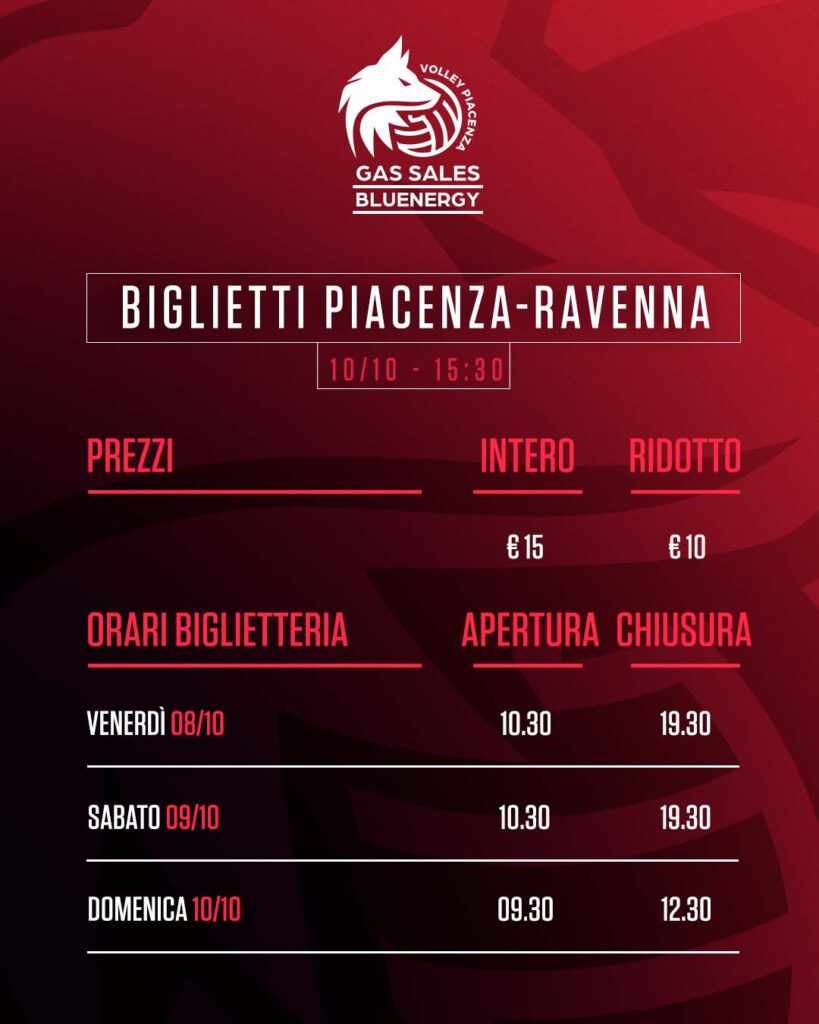 I biglietti per la sfida Gas Sales Piacenza – Consar RCM Ravenna, in programma domenica 10 ottobre alle 15:30, saranno in prevendita da domani venerdì 8 ottobre a partire dalle 10:30