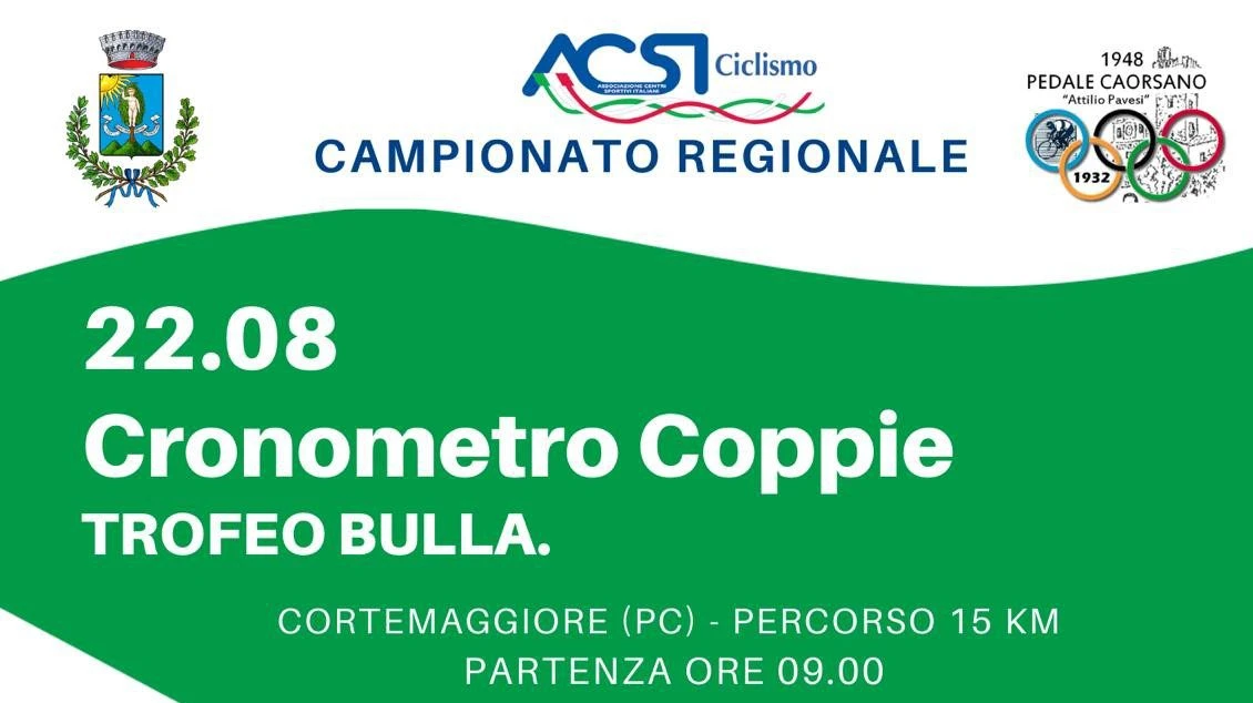 C’è un altro grande appuntamento in programma nel piacentino per gli amanti del ciclismo: il 22 agosto 2021, il Pedale Caorsano e Flavio Fummi (presidente sezione provinciale Acsi) organizzano la Cronometro Coppie-Trofeo Bulla, valida come campionato regionale ACSI. Su un percorso di 15km, scenderanno in campo ben 6 categorie diverse.