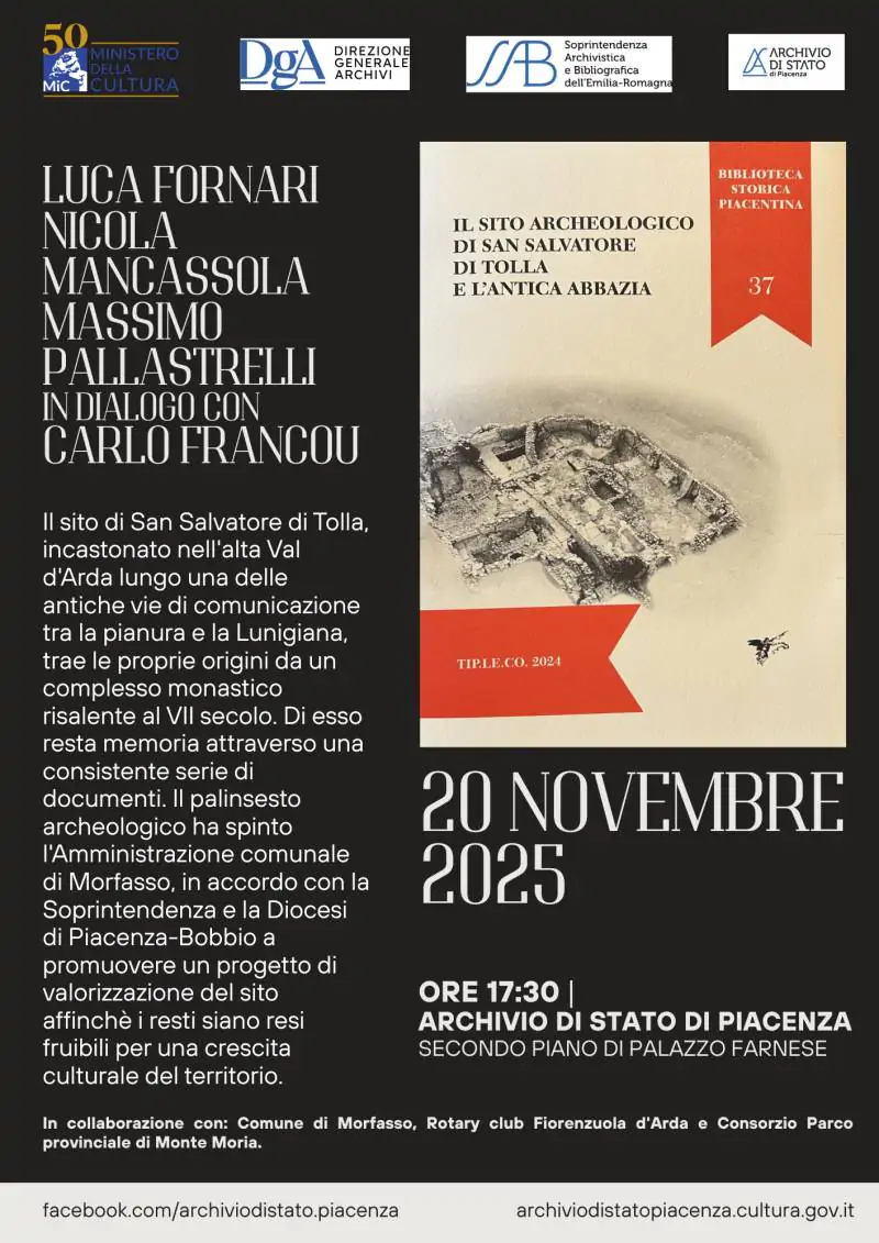 “Il sito archeologico di San Salvatore di Tolla e l’antica abbazia”, è il titolo dell’incontro in programma giovedì 20 novembre, ore 17.30 all’Archivio di Stato di Piacenza (secondo piano di Palazzo Farnese). Presenti gli archeologi Luca Fornari, Nicola Mancassola e lo storico Massimo Pallastrelli in dialogo con il curatore Carlo Francou.