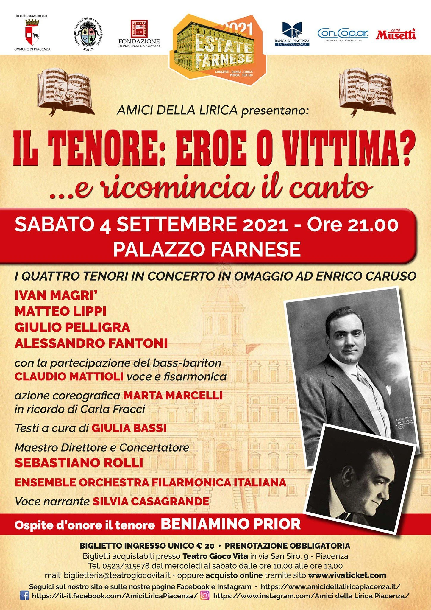 S’intitola “Il tenore: eroe o vittima? …E ricomincia il canto. I quattro tenori in concerto in omaggio a Enrico Caruso”lo spettacolo che andrà in scena a Palazzo Farnese domani, sabato 4 settembre alle 21 nell’ambito della rassegna #EstateFarnese.