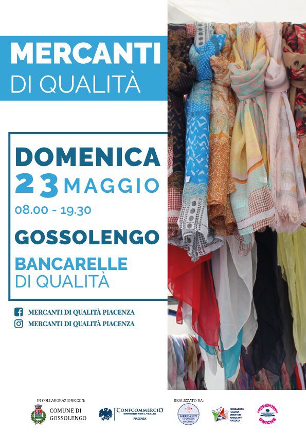 Anche sul territorio di Gossolengo arriva domenica 23 maggio il Mercato Straordinario di Primavera con gli ambulanti dell’Associazione Mercanti di Qualità. Una vetrina e un’opportunità per il territorio. L’evento si svolge dalle 8 alle 19 con più di 30 banchi di tutti i generi: abbigliamento firmato, calzature, accessori moda, intimo e biancheria, fiori e piante, enogastronomia con specialità del territorio, oggettistica e tanto altro. Grazie ai prodotti made in Italy si ha l’occasione di vivere una giornata di shopping di qualità in totale sicurezza. La prossima domenica, 30 maggio, i Mercanti di qualità approderanno poi a Caorso.