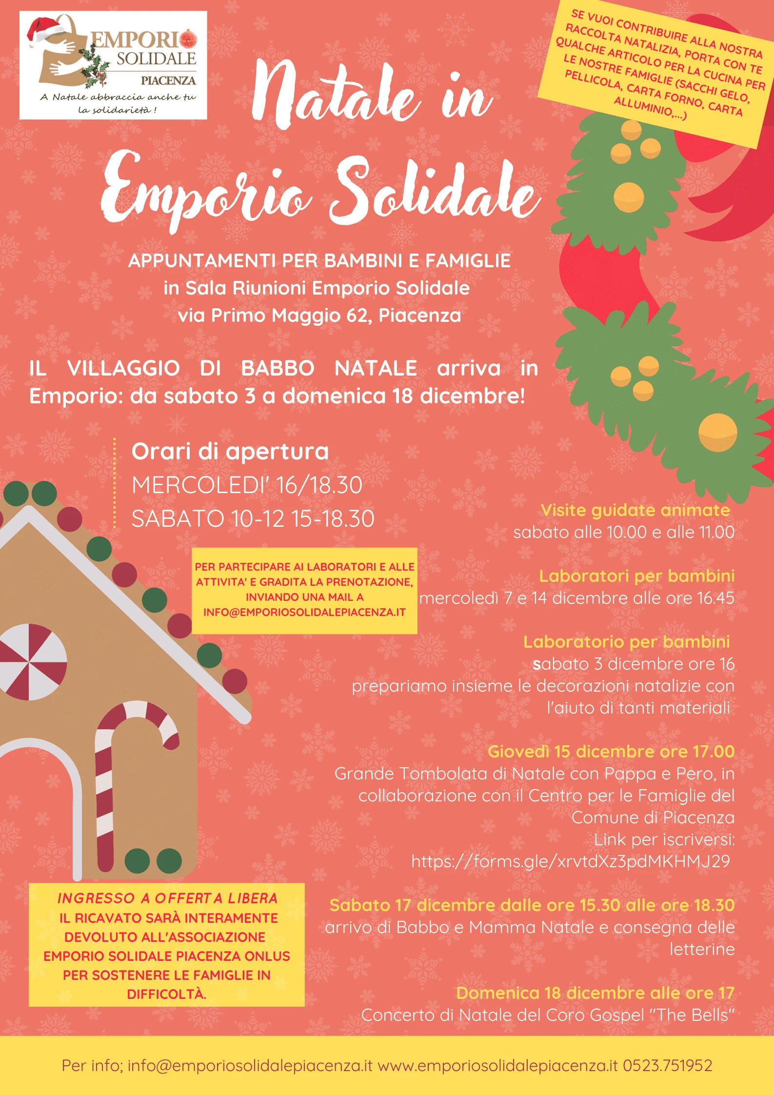 | L’ingresso al Villaggio è a offerta libera, tutto il ricavato sarà devoluto all’Associazione Emporio Solidale Piacenza Onlus, per sostenere le famiglie in temporanea difficoltà. Per partecipare ai laboratori e alle visite guidate è gradita la prenotazione. Nel periodo natalizio Emporio propone alla cittadinanza la raccolta di accessori per la cucina, articoli indispensabili nelle case di tutti noi e solitamente difficili da reperire. Nel mese di dicembre, chi desidera può contribuire alla raccolta |