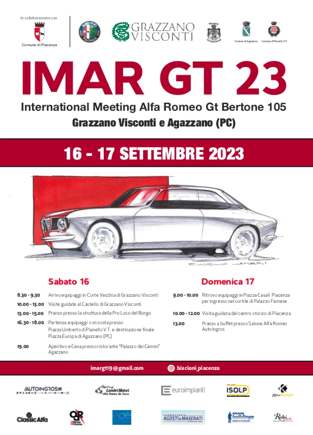 Biscioni Piacenza organizza IMAR GT 23 un evento Alfa Romeo dedicato ad un modello specifico che quest’anno festeggia il 60° anniversario:la Giulia Sprint GT, in programma il 16 e 17 settembre a Grazzano Visconti e Agazzano.