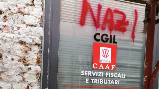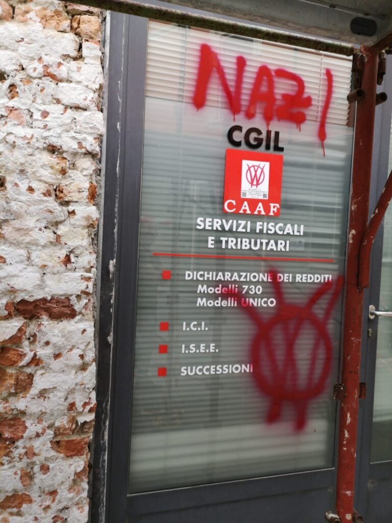 Imbrattata la sede della Cgil di Monticelli. Sulla vetrata della sede sono comparse scritte riconducibili al movimento No Vax. Compare infatti un simbolo noto, impiegato da una delle single più intransigenti. Il simbolo accompagna la scritta “Nazi”. Un gesto che sta sollevando più di una polemica considerata anche la giornata di oggi, Primo Maggio.