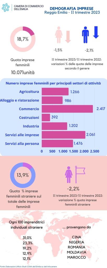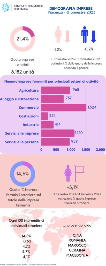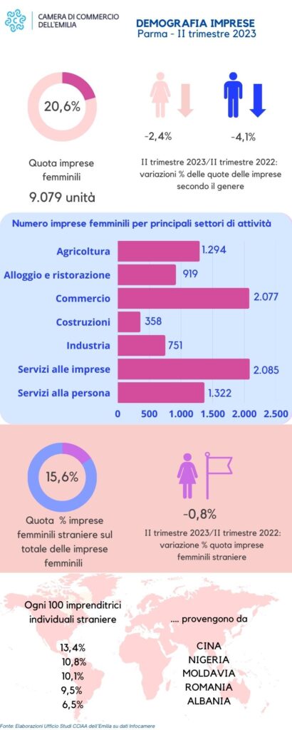 In tutte le province, il settore del commercio risulta essere quello caratterizzato dalla maggior presenza di imprese femminili. Parma conta 2.077 imprese femminili nel commercio, Reggio Emilia ne ha 2.417, mentre Piacenza conta 1.524 imprese. I servizi sono in buona tenuta o in crescita nelle tre province. In particolare, i servizi alle imprese a Piacenza registrano un aumento del 1,3%, a Parma del 1,6% e a Reggio Emilia dello 0,8%. I servizi alle persone presentano un andamento positivo a Reggio Emilia (+0,7%) e Piacenza (+0,2%), mentre subiscono un calo a Parma (-0,7%). Il settore agricolo registra un calo in tutte e tre le province: –2% a Reggio Emilia, -3,2% a Parma e –4,9% a Piacenza.