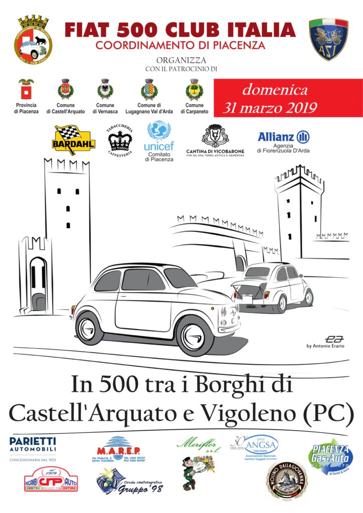 “In 500 tra i Borghi di Castell’Arquato e Vigoleno”, domenica 31 marzo raduno della storica auto Fiat. In particolare l’evento è organizzato dal Fiat 500 Club Italia, Coordinamento di Piacenza.