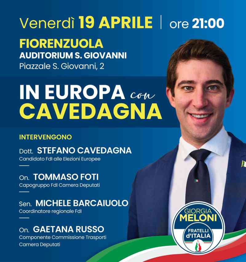 “La serata vedrà come protagonista – spiegano i locali rappresentanti di FdI – il candidato alle elezioni europee Stefano Cavedagna, il quale dimostra grandissima attenzione per il nostro territorio, trattandosi questa della terza volta in pochi mesi nel quale vi si reca, pur dovendosi misurare con una circoscrizione elettorale che ricomprende interamente le regioni Emilia-Romagna, Veneto, Trentino-Alto Adige e Friuli-Venezia Giulia”.