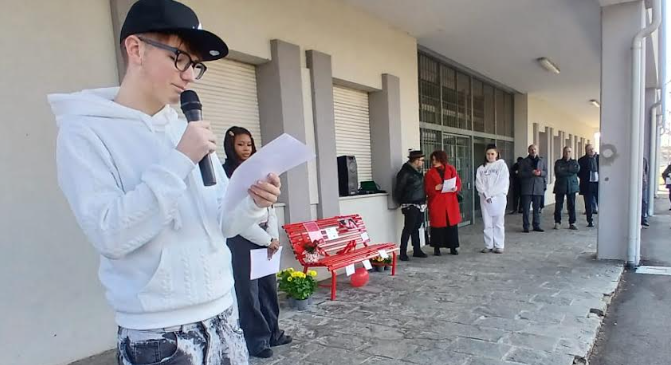 Sulla panchina sono state appoggiate scarpe rosse, simbolo dell’assenza di chi non c’è più, ma anche del diritto negato di sentirsi libere di indossarle. Accanto, fiori a rappresentare la speranza di un futuro senza violenza e messaggi scritti dagli studenti, in italiano, arabo e spagnolo, a sottolineare il carattere universale di questa battaglia.