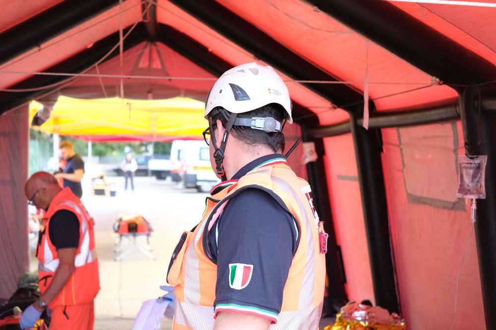 L’impatto scenico è forte, ma l’arrivo dei mezzi avviene in modo composto. I Carabinieri preservano la sicurezza dell’intervento, specie con “una simulatrice particolarmente agitata”. I militi del SEIRS provenienti da Parma, grazie anche al supporto di operatori di Protezione Civile, attivano e gonfiano in pochi minuti una tenda. Struttura atta a simulare la struttura di un PMA (Posto Medico Avanzato), che avrà il compito di ricevere i pazienti.
