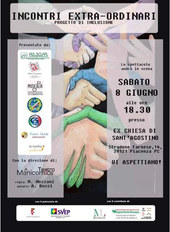 Sabato 8 giugno 2019 alle ore 18.30 a Piacenza Ex Chiesa Sant’Agostino Stradone Farnese va in scena “Incontri ExtraOrdinari”. In particolare si tratta di uno spettacolo teatrale frutto di un percorso condiviso dalle associazioni, guidate dall’attore regista Mauro Mozzani e dal collaboratore Agostino Bossi del Teatro Manicomics. Insieme hanno scelto il Teatro come strumento di espressione e di integrazione delle diversità dove i tanti linguaggi e le lingue differenti s’incontrano e riescono a “com-prendersi”. Soprattutto superando le barriere comunicative tradizionali.