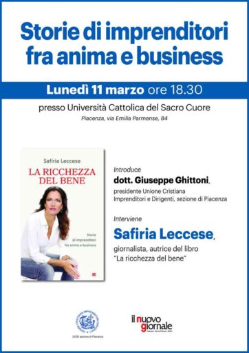 La Sezione di Piacenza dell’UCID – Unione Cristiana Imprenditori Dirigenti e Il nuovo giornale organizzano per lunedì 11 marzo alle ore 18.30 un incontro con Safiria Leccese, giornalista e autrice del libro “La ricchezza del bene”.