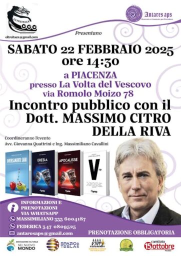 Su iniziativa delle Associazioni Oltreitaca e Antares, sabato 22 Febbraio alle ore 14.30, presso la  Volta del Vescovo  in via Romolo Moizo 78 a Piacenza, si terrà un incontro pubblico con il Dott.Massimo Citro della Riva, autore di best sellers quali “Eresia” e “Apocalisse“.