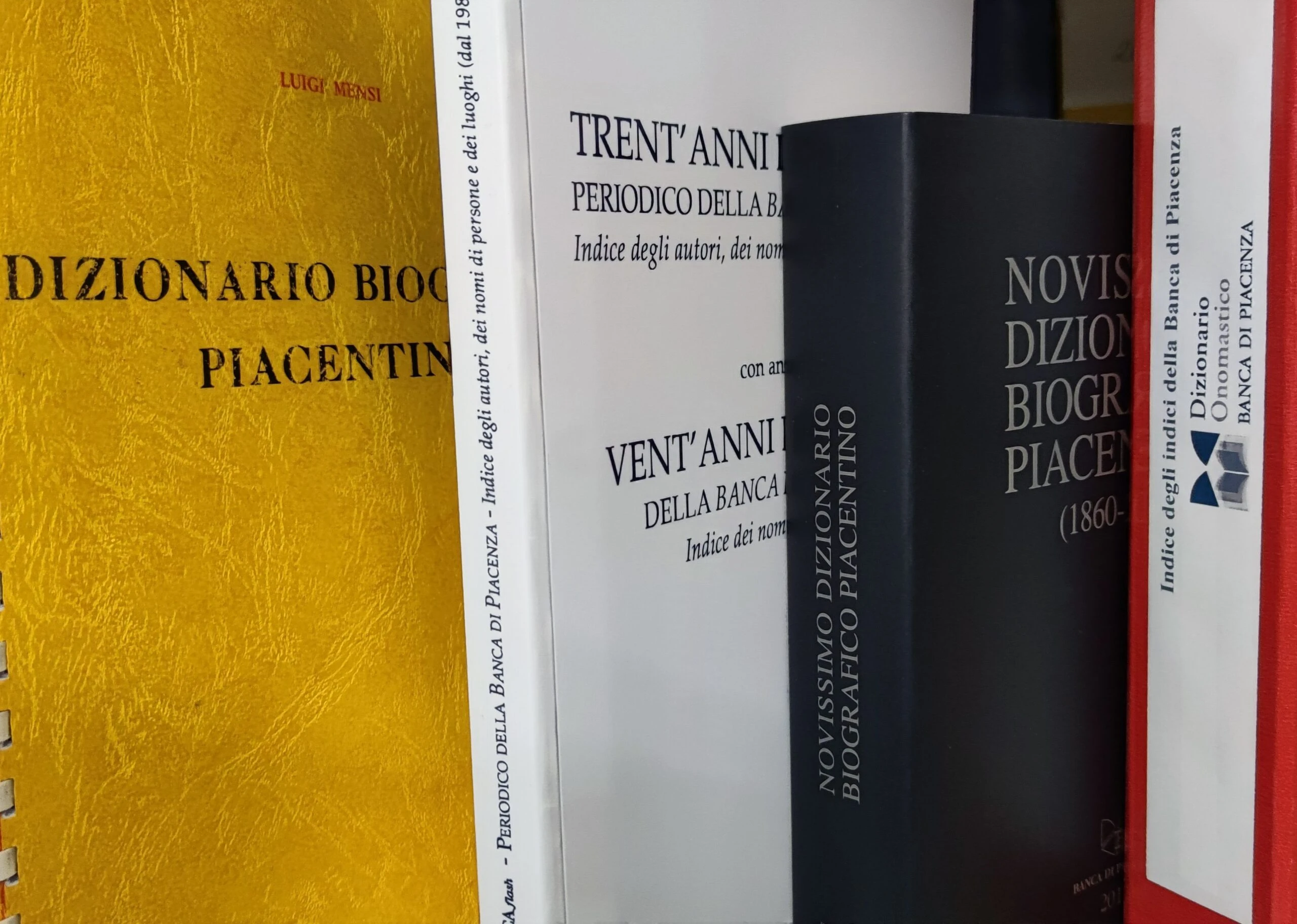 I nomi di persona presenti nel Dizionario onomastico sono ora in totale 27.263. I 17.530 precedenti l’aggiornamento sono contenuti nelle pubblicazioni onomastiche – tutte presenti, per chi non ne avesse la disponibilità, nella Biblioteca della Banca – “Novissimo Dizionario Biografico Piacentino” (ed. Banca di Piacenza, 2018), “Dizionario Biografico Piacentino” di Luigi Mensi (ed. Ditta A. del Maino, 1899; ristampa anastatica Banca di Piacenza, 1978) e “Appendice al Dizionario Biografico Piacentino” di Luigi Mensi (ed. Arnaldo Forni editore, 1980), “Trent’anni di BancaFlash. Periodico della Banca di Piacenza dal 1987 al 2016” (ed. Banca di Piacenza, 2018), “Vent’anni di bilanci della Banca di Piacenza. Indice dei nomi di persone dal 1988 al 2007” (ed. Banca di Piacenza, 2018), “Dizionario dei musicisti e della musica di Piacenza” di Gaspare Nello Vetro (ed. Banca di Piacenza, 2010).