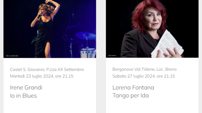 Prosegue l’edizione 2024 di Val Tidone Festival. A Castel San Giovanni martedì 23 luglio arriva l’anima blues di Irene Grandi, mentre domenica 27 luglio spazio al tango con Lorena Fontana a Borgonovo Val Tidone, Loc. Breno. Le serate iniziano alle ore 21.15.