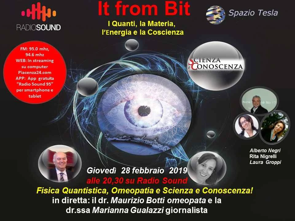 It From Bit, omeopatia e Scienza e Conoscenza sono gli argomenti in programma giovedì 28 Febbraio alle ore 20,30 su Radio Sound. La trasmissione radiofonica di fisica e medicina quantistica realizzata in collaborazione con Spazio Tesla.
