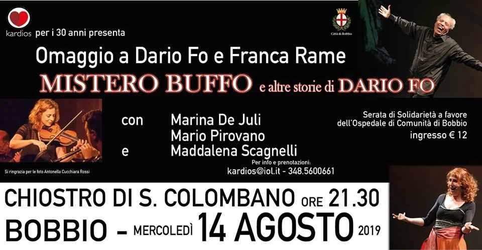 Vent’anni fa Franca Rame e Dario Fo vennero a Bobbio a rappresentare “Mistero Buffo” in solidarietà con Kardios, che festeggiava i dieci anni di attività. Una serata indimenticabile a favore dell’ospedale di Bobbio.