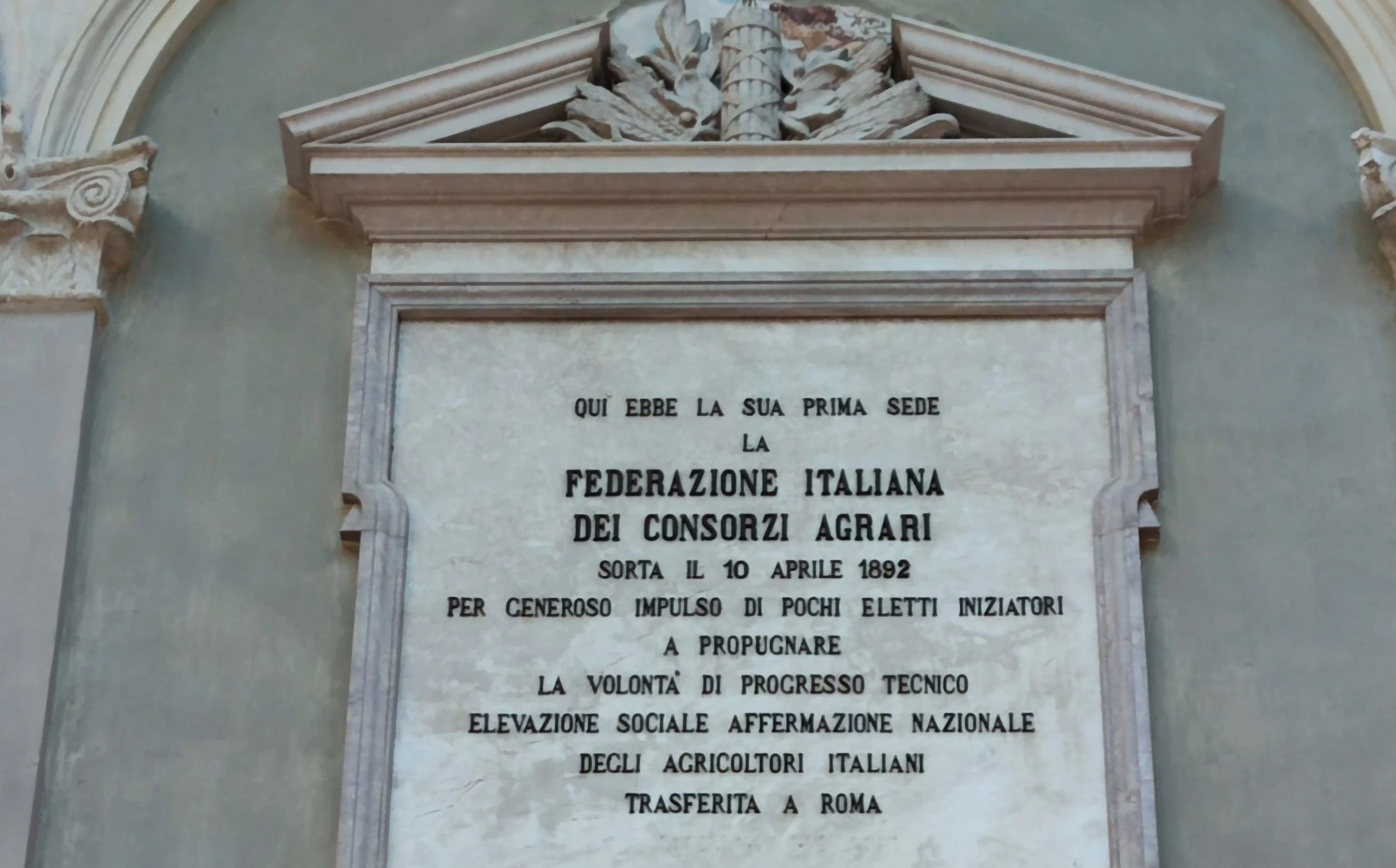 “Qui ebbe la sua prima sede la FEDERAZIONE ITALIANA DEI CONSORZI AGRARI sorta il 10 aprile 1892 per generoso impulso di pochi eletti iniziatori a propugnare la volontà di progresso tecnico, elevazione sociale, affermazione nazionale degli agricoltori italiani. Trasferita a Roma. Piacenza 10 aprile 1942”.