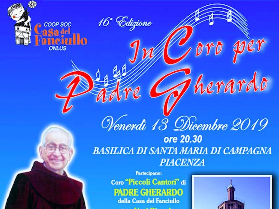 L’evento “In Coro per Padre Gherardo” 16^ edizione, è in programma venerdì 13 dicembre alle 20.30 presso la Basilica di Santa Maria di Campagna. Un’occasione per mantenere vivo l’impegno di Padre Gherardo verso i più “piccoli”. Inoltre si tratta di una serata per sostenere la Casa del Fanciullo nelle sue attività e nei suoi progetti a favore dell’infanzia.