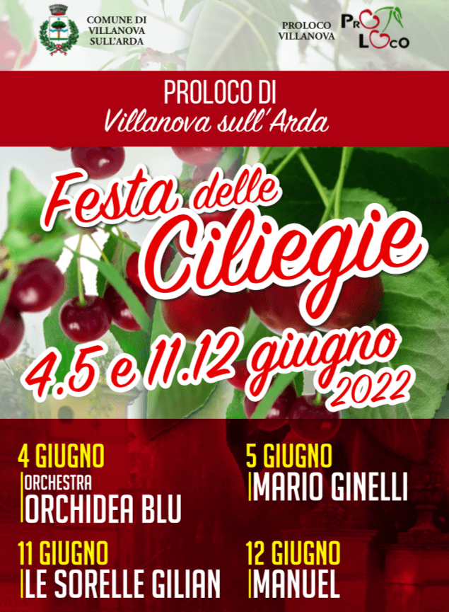 La Festa delle ciliegie a Villanova sull’Arda, due fine settimana di allegria e squisitezze dal 4 al 12 giugno. Nell’appuntamento proposto dal Comune e dalla locale Pro Loco si potranno trovare specialità gastronomiche locali, camminate, trenino delle ciliegie e dei sapori e stand con le famose ciliegie di Villanova.