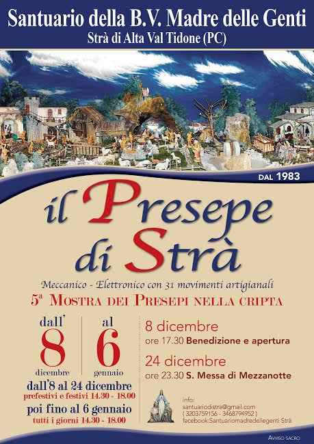 La meraviglia del presepe di Strà con i suoi 28 movimenti meccanici è pronto a regalare la magia del Natale anche nel 2019. L’ inaugurazione è prevista domenica 8 dicembre alle ore 17 30 al santuario della Beata Vergine Madre delle Genti. L’allestimento sarà visitabile fino al 6 gennaio 2020 a Strà di Alta Val Tidone (Pc).