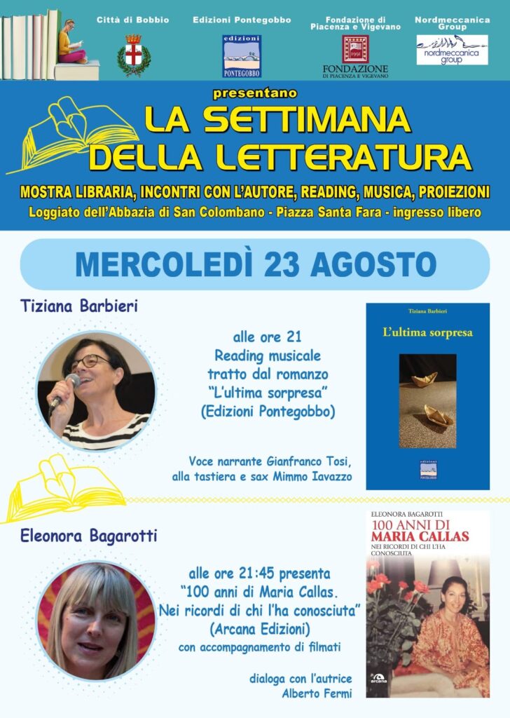 Questa sera sarà dedicata alla musica, con il reading tratto dal romanzo di Tiziana Barbieri “L’ultima sorpresa” (Edizioni Pontegobbo), una rivisitazione in chiave contemporanea e interiore dei due eroi omerici Ulisse e Achille, con letture e accompagnamento alla tastiera e sax. A seguire Eleonora Bagarotti presenterà “100 anni di Maria Callas. Nei ricordi di chi l’ha conosciuta ” (Arcana Edizioni) in dialogo con Alberto Fermi e il supporto di proiezioni.