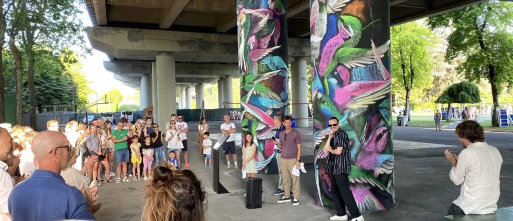 Un’opera di grande effetto scenico. Con tanti variopinti colibrì che risalgono i piloni dell’autostrada per raggiungere la sommità del viadotto dipinta di azzurro, come un cielo d’estate.