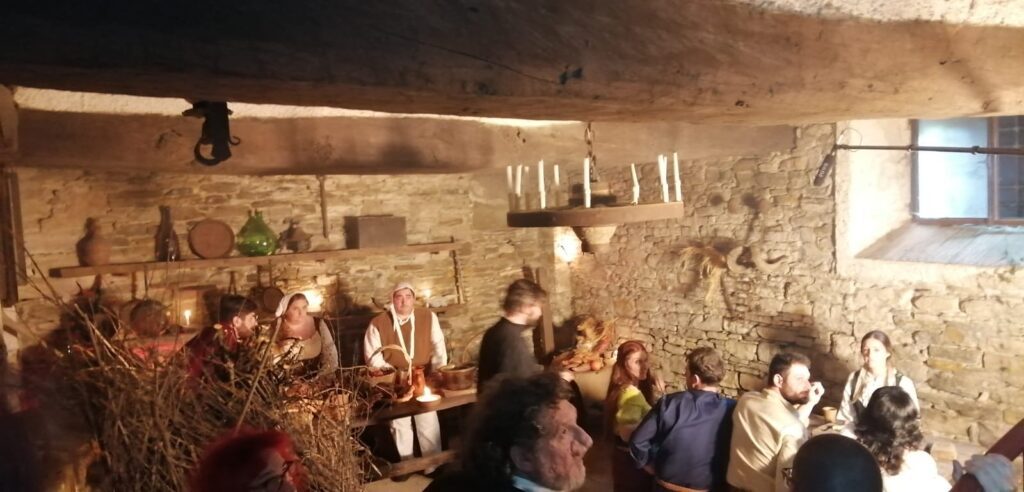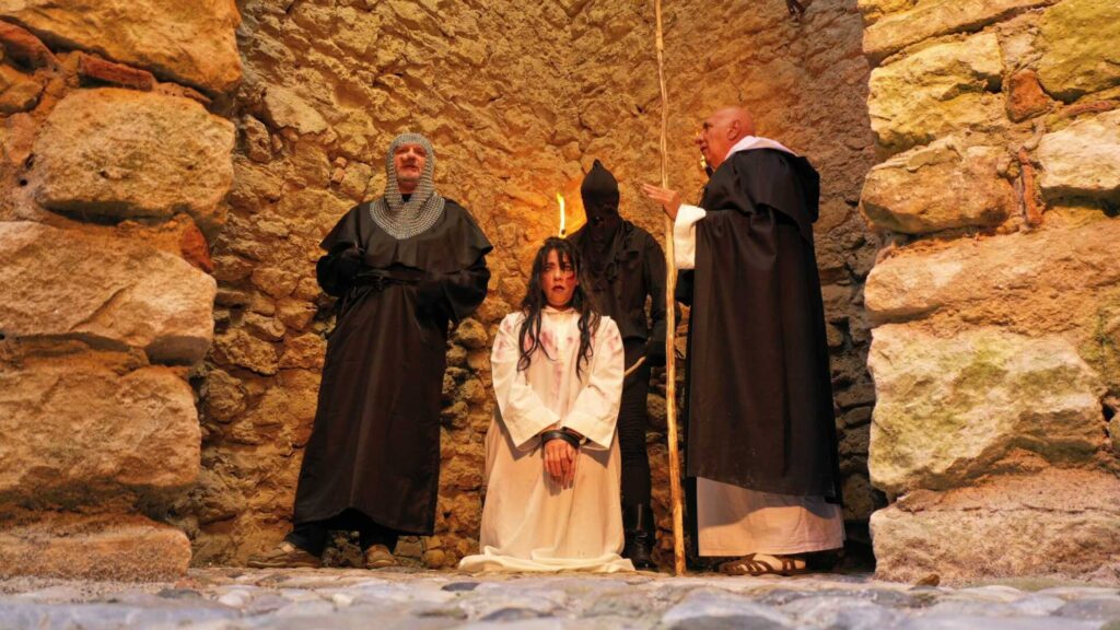 Le scene in questione erano intrighi e schermaglie amorose in costume medievale, ma in un palazzo antico c’è stata pure la ricostruzione di un’antica taverna del 1300 con i suoi pittoreschi clienti. “La strega di Baratti” che prende spunto da un eccezionale ritrovamento archeologico in Etruria, racconta, in parallelo temporale, la storia di due donne (una del medioevo e una dei nostri giorni) che si sentono in “risonanza” – connesse, come se esistesse un fil rouge che va al di là del tempo e dello spazio – e ricostruisce la possibile causa della strana sepoltura di questo personaggio femminile, vissuto forse nel XIII secolo, vittima della superstizione popolare e così temuto dalla popolazione da essere addirittura inchiodato e sepolto con una manciata di chiodi nella bocca.