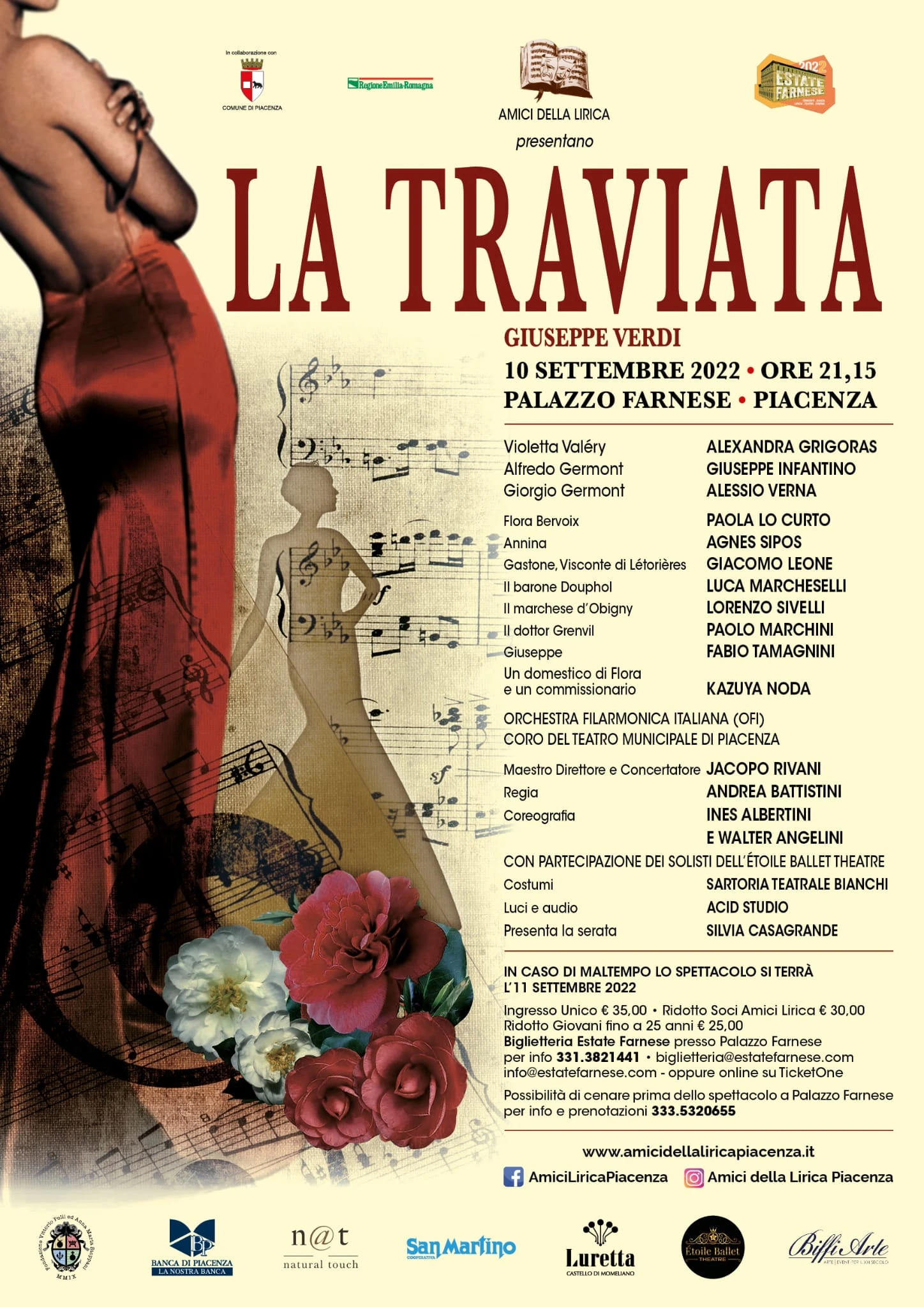 Il soprano Alexandra Grigoras sarà Violetta, il tenore Giuseppe Infantino vestirà i panni di Alfredo ed il baritono Alessio Verna interpreterà Germont, Flora sarà Paola Lo Curto e…ancora il coro del Teatro Municipale, l’OFI – Orchestra Filarmonica Italiana composta da cinquanta orchestrali diretta dal maestro Jacopo Rivani e con la partecipazione dei solisti dell’Etòile Ballet Theatre. Che altro? Verrebbe da dire.