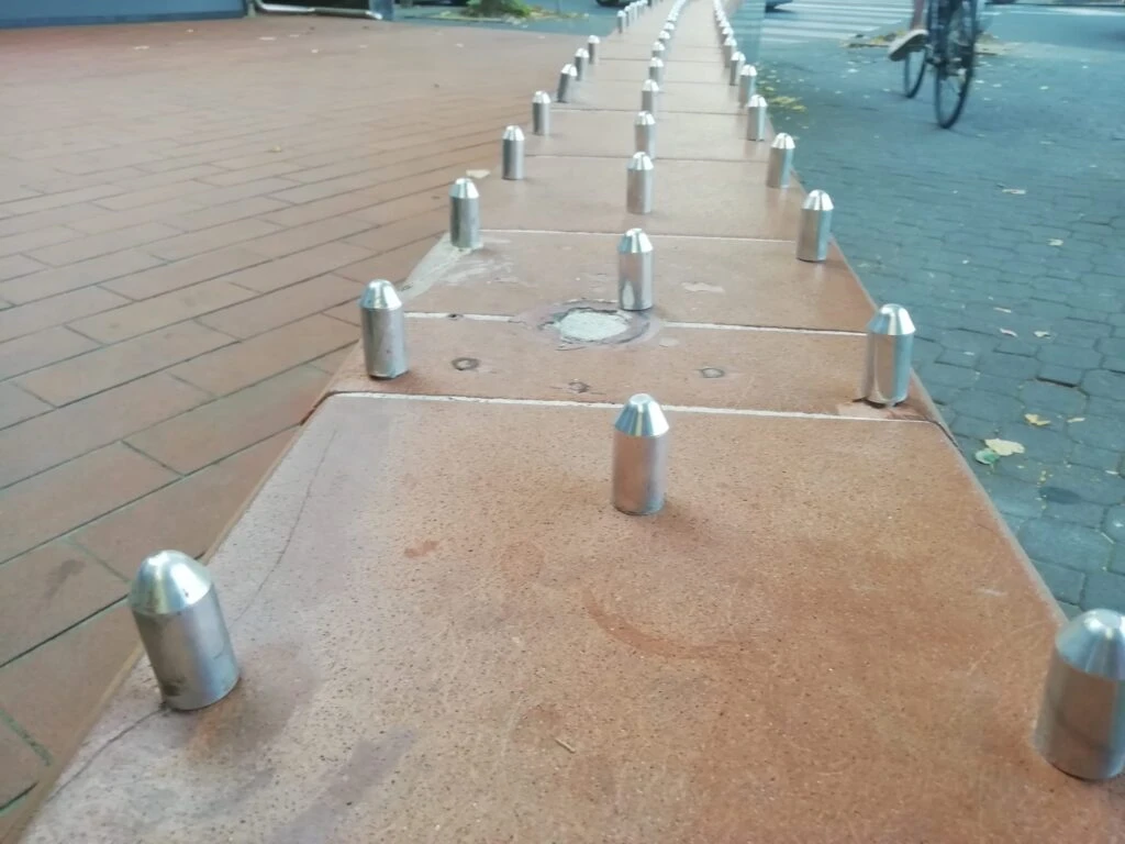 Nei giorni scorsi è apparso in città un intervento antiseduta, formato da centinaia di spuntoni in acciaio, sul muretto che si affaccia in Piazzale Libertà a delineare uno spazio che un tempo apparteneva a un bar.