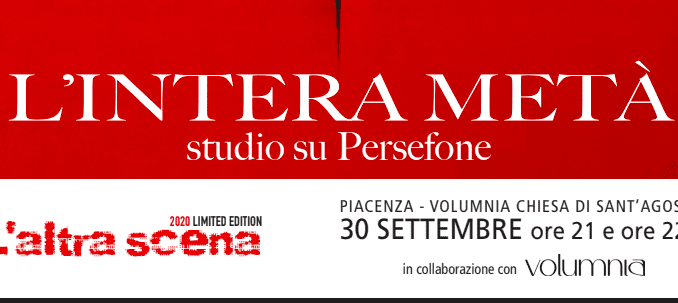 L’Altra Scena, il 30 settembre: “L’INTERA METÀ studio su Persefone”. Prosegue l’edizione 2020 – limited edition – del Festival di teatro contemporaneo curato da Jacopo Maj e organizzato da Teatro Gioco Vita con Fondazione Teatri di Piacenza, il sostegno della Fondazione di Piacenza e Vigevano e Iren e la collaborazione dell’Associazione Amici del Teatro Gioco Vita.