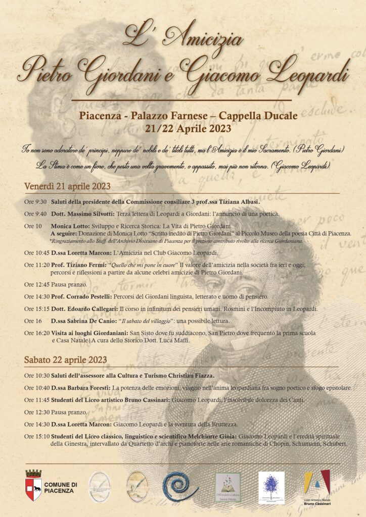 L’amicizia tra Pietro Giordani e Giacomo leopardi, un rapporto quasi filiale al centro di un convegno che si terrà a Piacenza venerdì 21 e sabato 22 aprile nella bellissima cornice della Cappella Ducale di Palazzo Farnese.