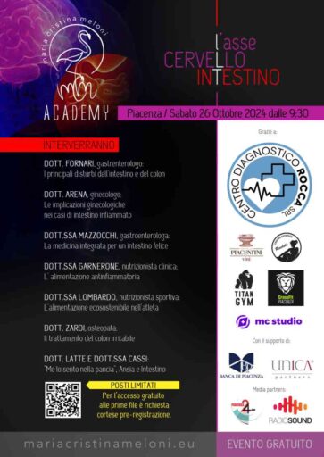 L’asse cervello intestino è il titolo del convegno scientifico che si terrà sabato 26 ottobre dalle 9,30 alle 12 al Palabanca Eventi nella Sala Corrado Sforza Fogliani della Banca di Piacenza via Mazzini 14. Saranno 7 gli autorevoli relatori che accompagnerannp i presenti all’insolita scoperta del rapporto tra pancia ed emozioni. Il convegno è organizato e sarà moderato dalla Dottoressa Maria Cristina Meloni Psicologa e Psicoterapeuta piacentina .