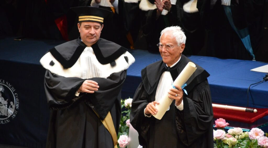 “Il lavoro vero porta lontano”. Queste le parole che Giorgio Armani ha rivolto agli studenti. Armani ha ricevuto dall’Università Cattolica la laurea honoris causa in “Global Business Management”.