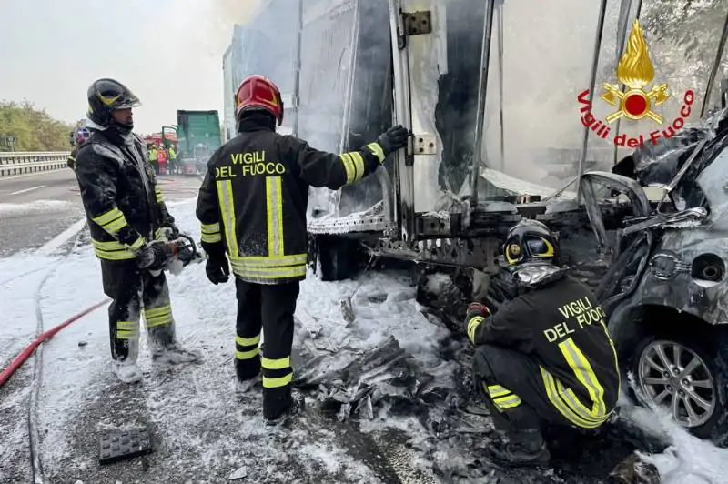 Secondo una prima ricostruzione pare che il conducente abbia perso il controllo del mezzo e abbia sbandato andando a schiantarsi contro un tir fermo nella piazzola di sosta a lato della carreggiata. L’auto, dopo l’impatto, ha preso fuoco.
