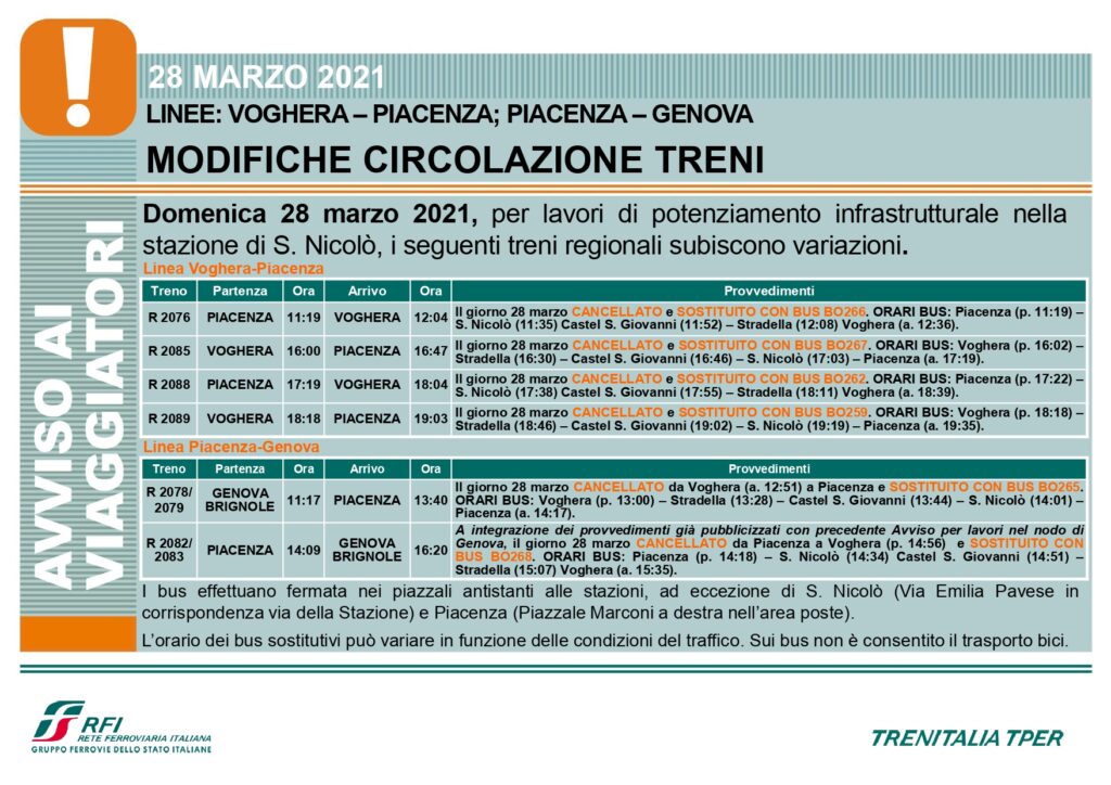 Domenica 28 marzo 2021, per lavori di Rete Ferroviaria Italiana (Gruppo FS Italiane) nella stazione di S. Nicolò (PC), sei treni regionali saranno sostituiti con autobus.
