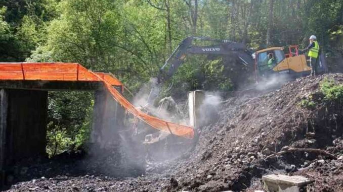 Quasi conclusa la demolizione del ponte sul rio del lago Moo in località Taravelli sulla strada di bonifica Ferriere-Rocca in Comune di Ferriere e prossima la costruzione della nuova opera.