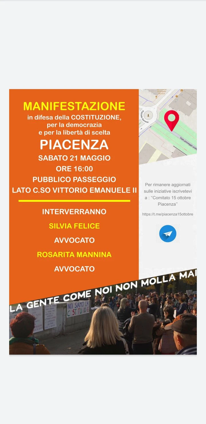 Sabato 21 maggio a Piacenza è in programma la manifestazione con ospiti le avvocatesse Silvia Felice e Rosarita Mannina che tratteranno il tema delle multe e dell’obbligo vaccinazione agli over 50 .
